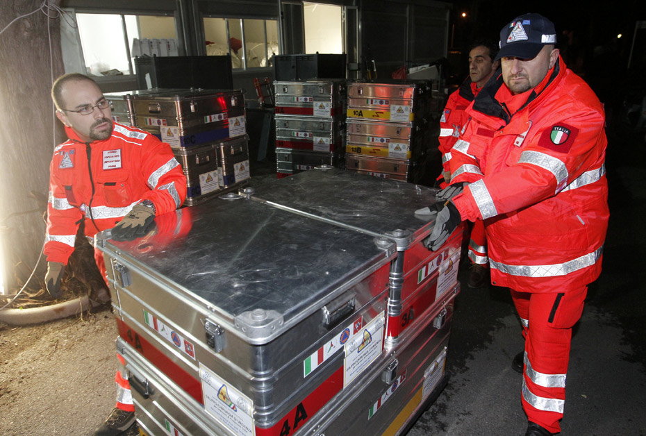 图为意大利救援队正在装备救援物资。海地发生强烈地震,伤亡惨重,国际社会在第一时间纷纷伸出援手。中国、美国、法国等多个国家和地区的救援队已集结完毕,奔赴海地地震灾区。图片来源:中国新闻网