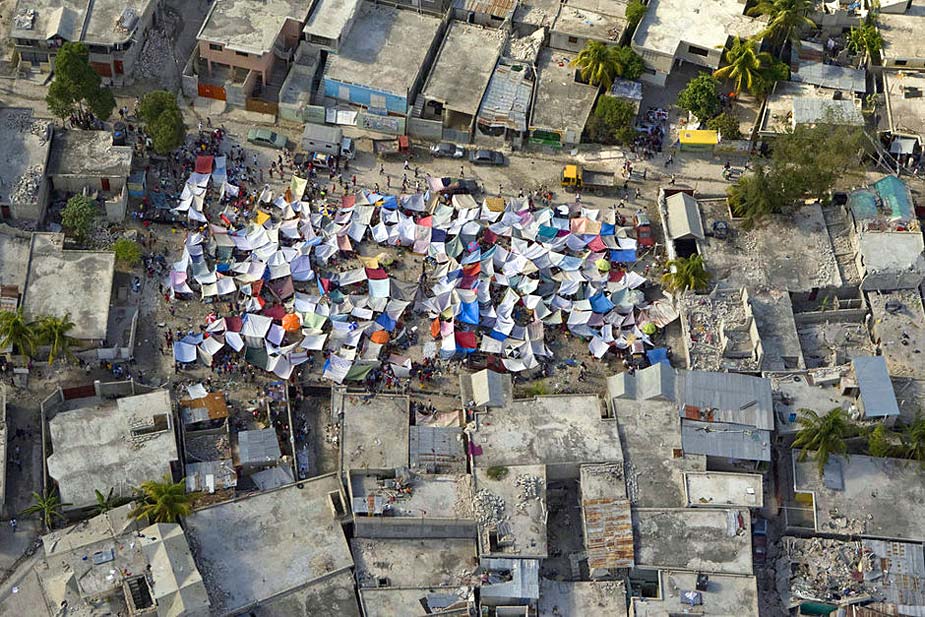 2010年1月13日,海地地震第二天,航拍震后太子港。临时帐篷。