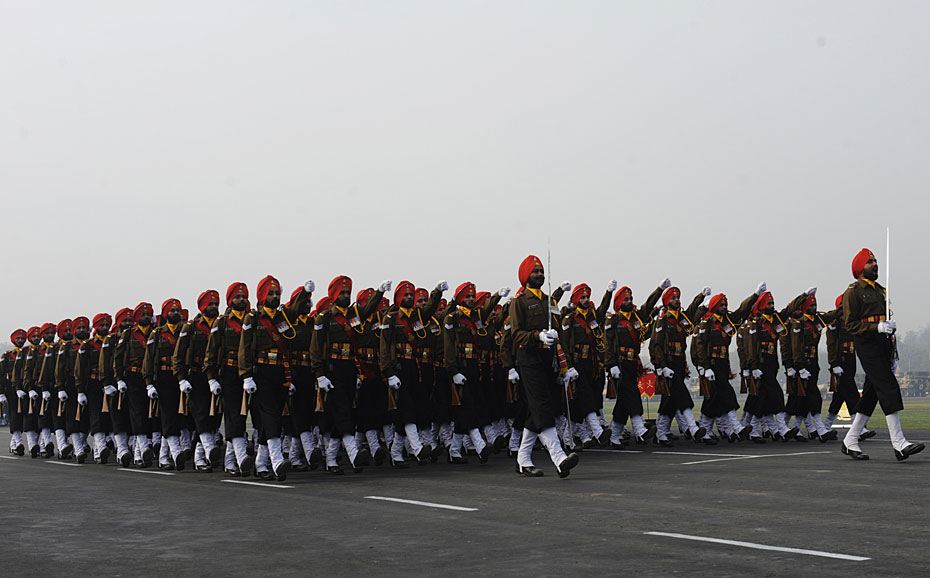 1月15日,在印度首都新德里举行的建军节阅兵式上,印度士兵接受检阅。图片来源:中国新闻网