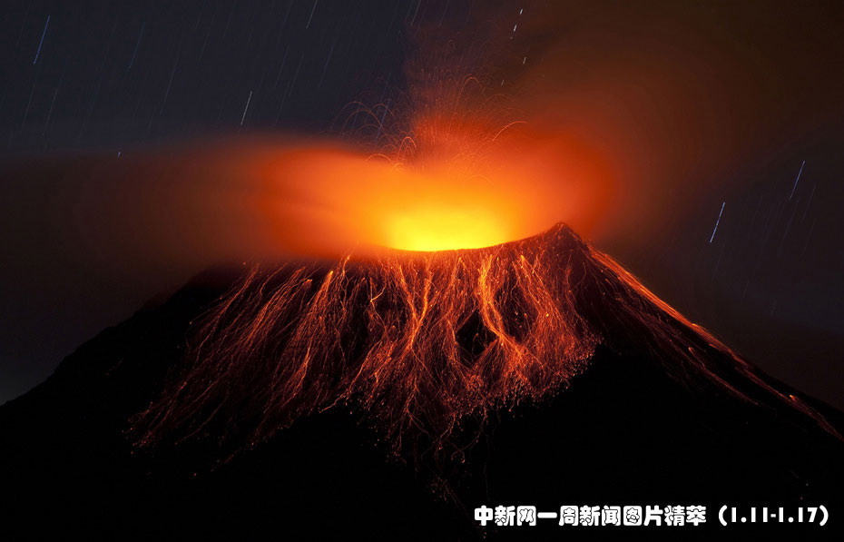 1月11日(周一),在厄瓜多尔首都基多附近,通古拉瓦火山喷发出岩浆和火山灰。图片来源:中国新闻网