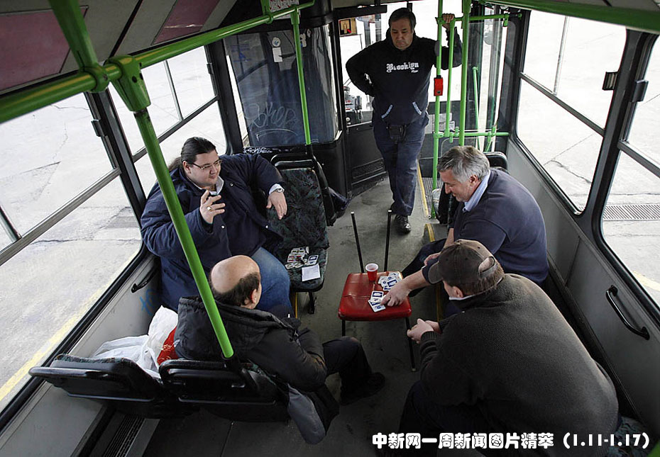 1月12日(周二),在布达佩斯一个汽车站,几名司机在一辆城市公交车内打牌。他们从周二开始罢工,要求提高工资并签订新的劳动合同。图片来源:中国新闻网