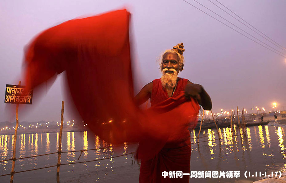 1月13日(周三),在印度阿拉哈巴德一年一度的佛浴节(Magh Mela)期间,一名印度教信徒在恒河沐浴后晾干衣服。图片来源:中国新闻网