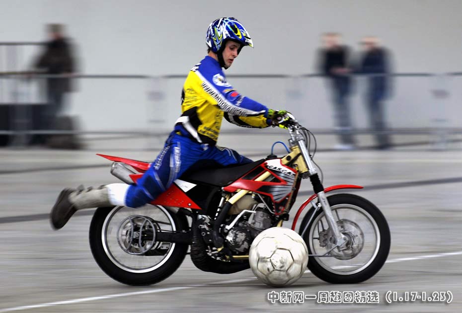 1月22日,国际摩托车贸易博览会上,一场名为“魅力摩托”的足球比赛吸引了众人的目光,参赛者驾驶摩托的同时还不忘将足球送入对方的大门。 图片来源:中国新闻网>>点击观看详细内容