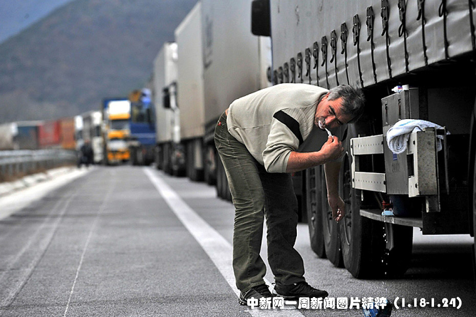 1月21日,一名卡车司机在希腊-保加利亚边境的一个岔道口刷牙。希腊农民封堵了道路,要求国家提供救助以弥补农产品价格偏低带来的损失。图片来源:中国新闻网