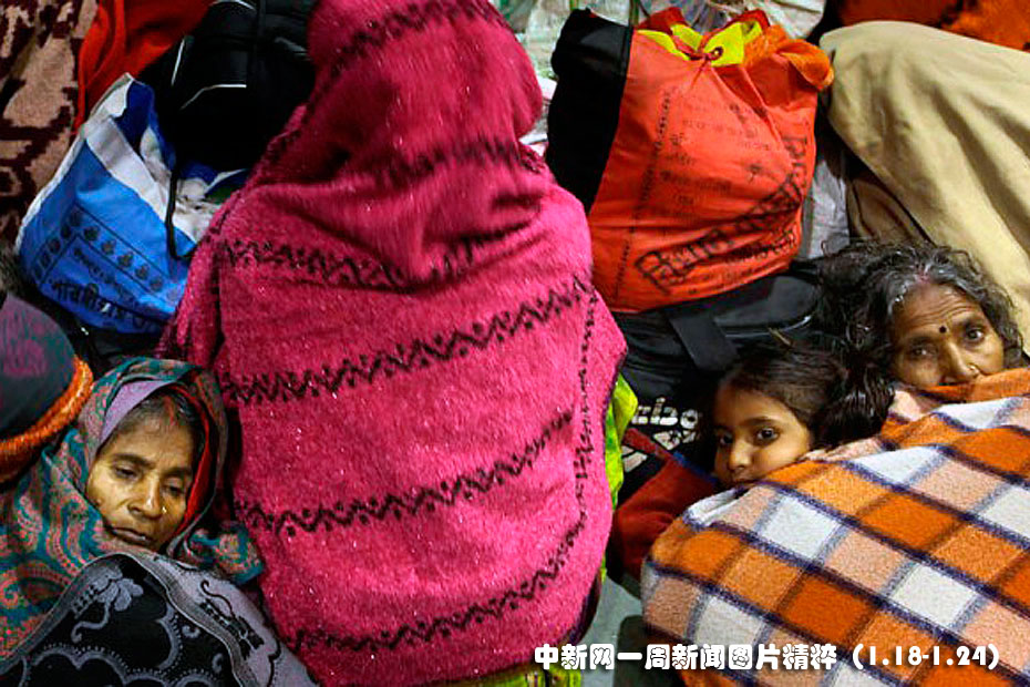 1月18日,乘客们在印度瓦拉纳西的火车站候车时裹着毯子取暖。大雾和严寒天气导致印度北部多个地区的交通中断,反常的寒冷天气已致使数十人丧生。图片来源:中国新闻网