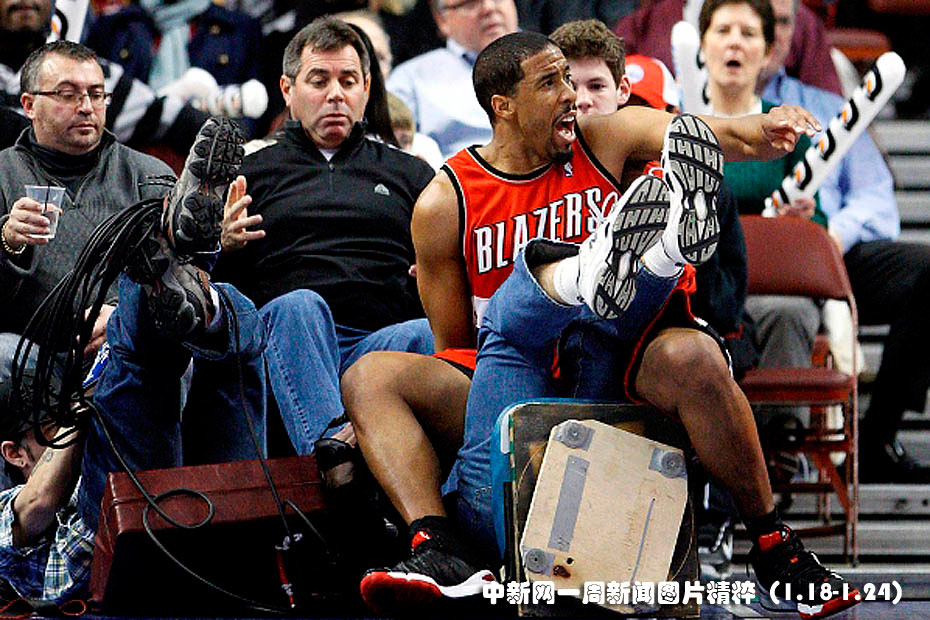 1月20日,波特兰开创者队后卫米勒在客场对阵费城76人队的比赛中抢球撞上场边的电视台工作人员。波特兰开创者最终以98比90击败费城76人队。图片来源:中国新闻网