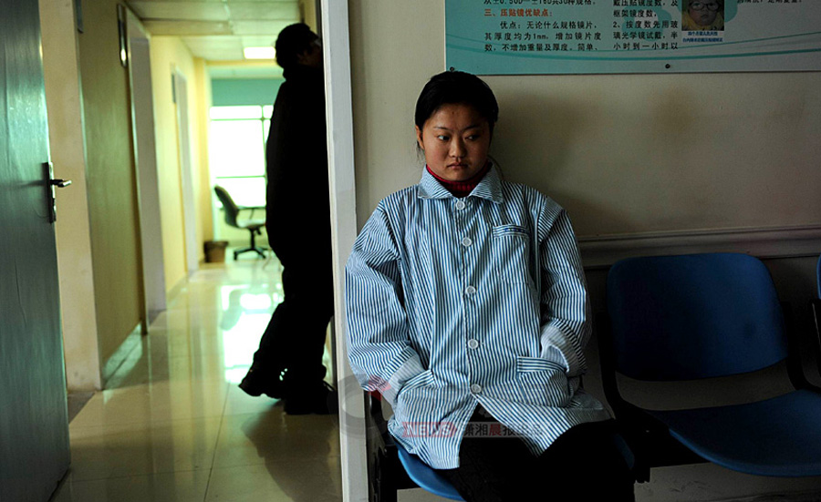 1月22日上午8点,武汉爱尔眼科医院。21岁的周霞眼神呆滞,坐在走廊等待术前的最后一次检查,她显得有点忐忑不安。潇湘晨报 记者 杨抒怀 摄
