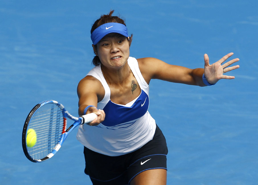 27日,中国选手李娜在澳大利亚网球公开赛上,以2-6、7-6、7-5顽强逆转实力超群的大威廉姆斯,携手郑洁闯入四强,并且创下了个人大满贯最佳成绩。图片来源:中国新闻网