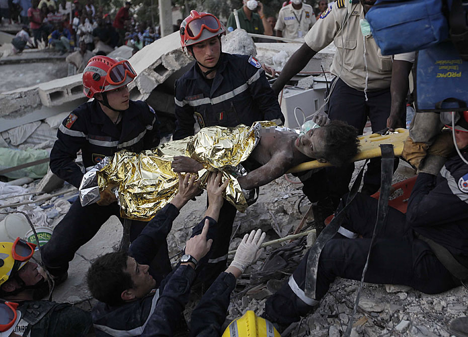 2010年1月27日,海地太子港,法国救援人员在一栋房屋的废墟下救出被困15天的16岁女孩黛琳娜·艾提尼(Daline Etienne)。女孩微弱的话语让大家着实吃惊:她竟是凭着随身的可乐挺了过来。图片来源:中国新闻网