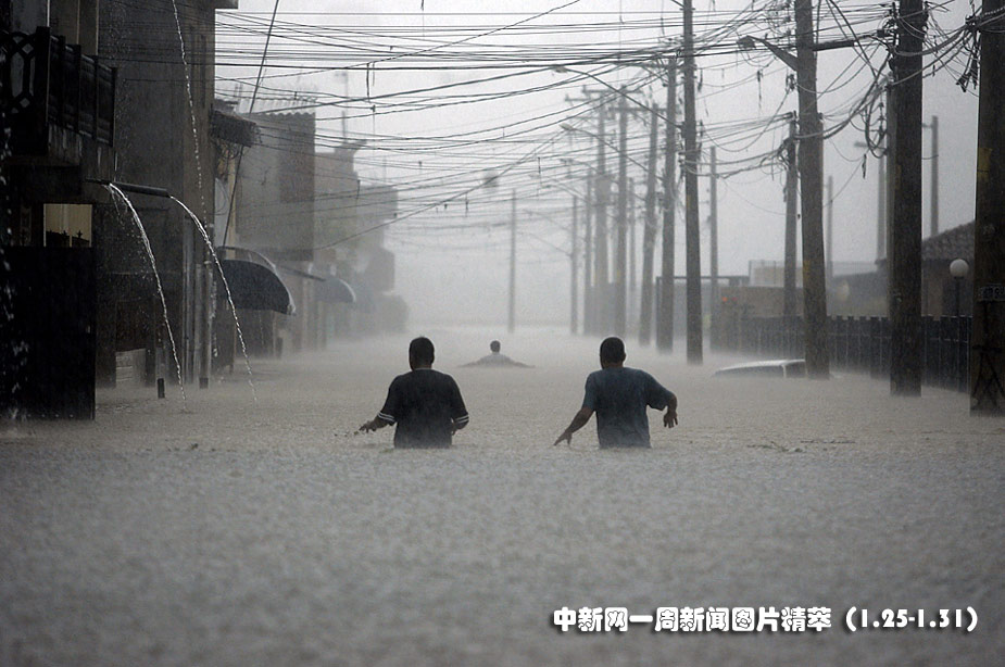 1月25日(周二),人们在巴西圣保罗洪水淹没的街道上艰难淌过。图片来源:中国新闻网
