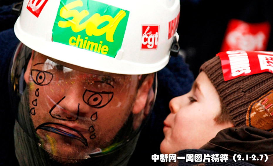 2月4日(周四),在法国敦克尔的罢工游行示威中,法国石油巨头道达尔(TOTAL)的一名员工戴着头盔,面罩上画着一张哭泣的脸。自去年9月开始,敦克尔厂区就一直处于停工状态。图片来源:中国新闻网