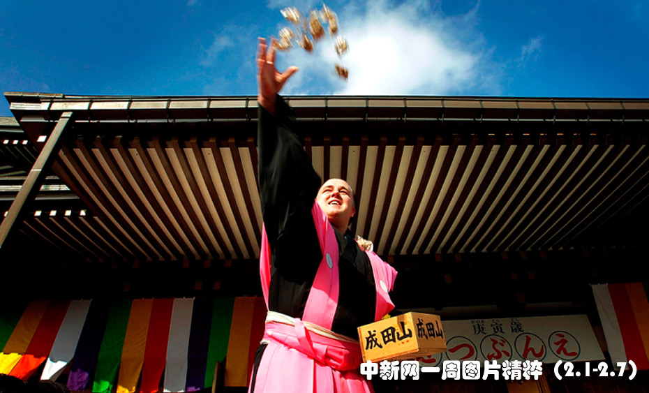 2月3日(周三),在日本千叶成田的一座寺庙,相扑新手、来自爱沙尼亚的巴鲁托(Baruto)向人群抛撒袋装的大豆。这种仪式通常在农历新年进行,据说可以带来好运。图片来源:中国新闻网
