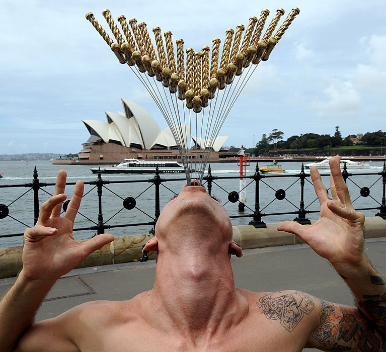 2月8日,街头艺人Chayne Hultgren在澳大利亚悉尼海港大桥前,一次吞下18把厚约1.3厘米,长约50.8厘米的长剑,刷新了吉尼斯世界纪录。图片来源:中国新闻网