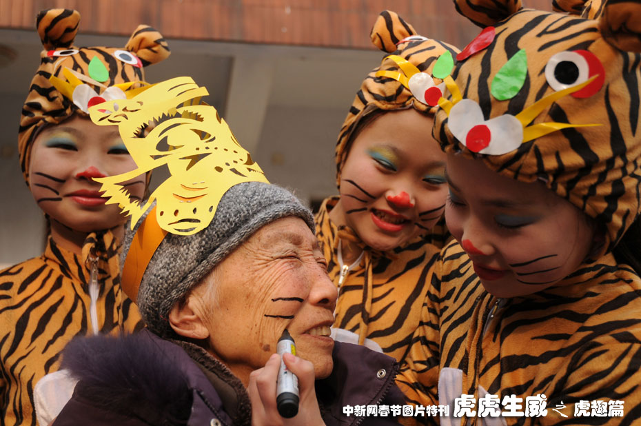 2月5日,河南省南阳市第十六小学的孩子们装扮成可爱的虎娃,向该市卧龙敬老院的老人们送去了新春的祝福。中新社发 付海厚 摄