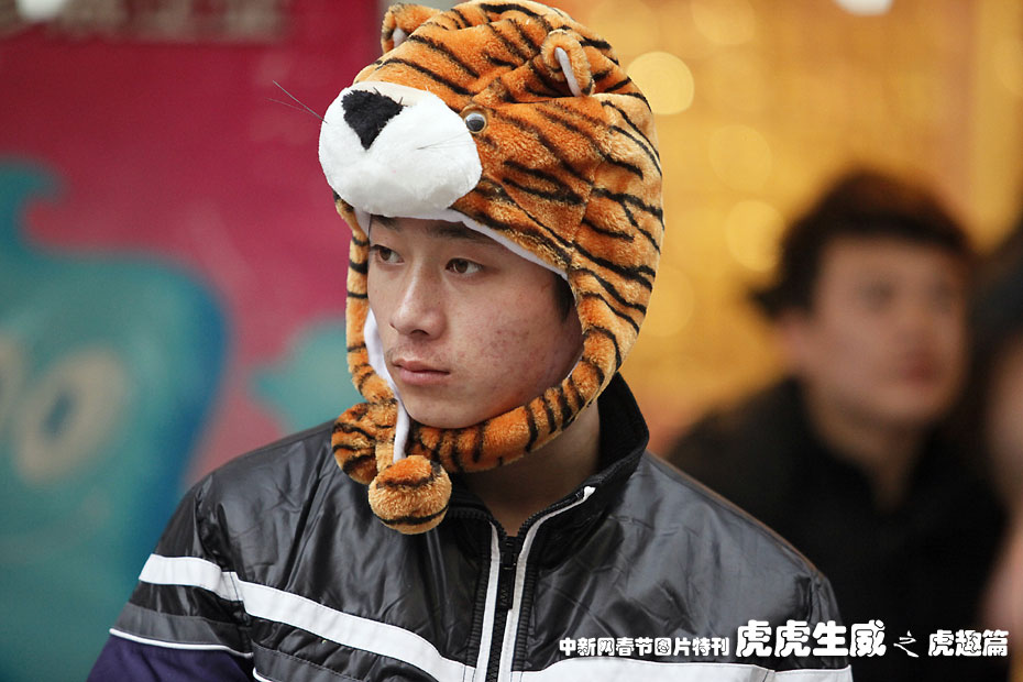 2月4日,上海人们头戴虎帽迎接新年的到来。