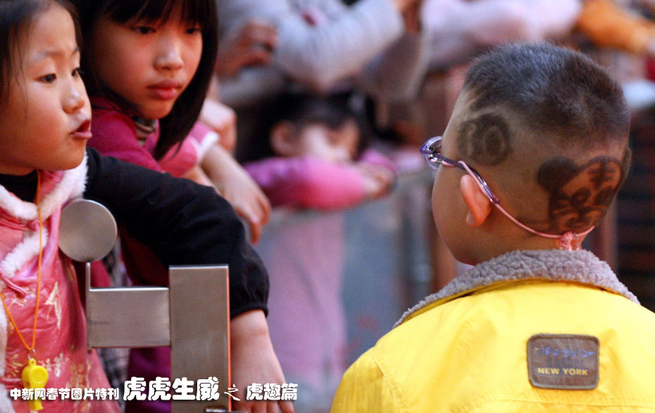 中国传统新年虎年将至,北京随处可见以虎为主题的各种雕塑、绘画以及装饰、礼品。图为近日北京一名小朋友以最新潮的“小老虎头”亮相显得别具新意。中新社发 钱兴强 摄