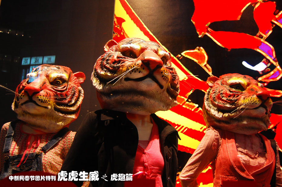 1月31日,上海市西藏中路的一家商店橱窗中,服装模特的头变成了老虎头,商家以“虎哥虎姐”吸引顾客前往购物。随着春节的临近,各大商家纷纷推出各类“虎年促销”,吸引顾客消费。中新社发 许康平 摄