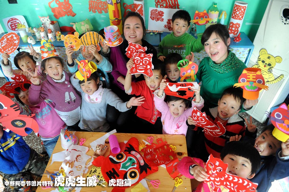 1月13日,北京西城区一所幼儿园的小朋友在老师带领下制作各种各样的老虎。他们用旧报纸、碎布条等废旧材料制作成各种构思奇妙、栩栩如生的手工制品,迎接即将到来的农历虎年。中新社发 远舟 摄