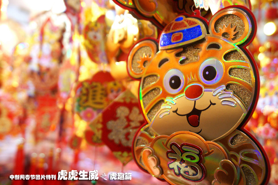 虎年临近,各地有关“虎”的喜庆装饰品热销。各种红色布老虎挂饰、红中国结营造出了红红火火的过年气氛。中新社发 梁铭 摄