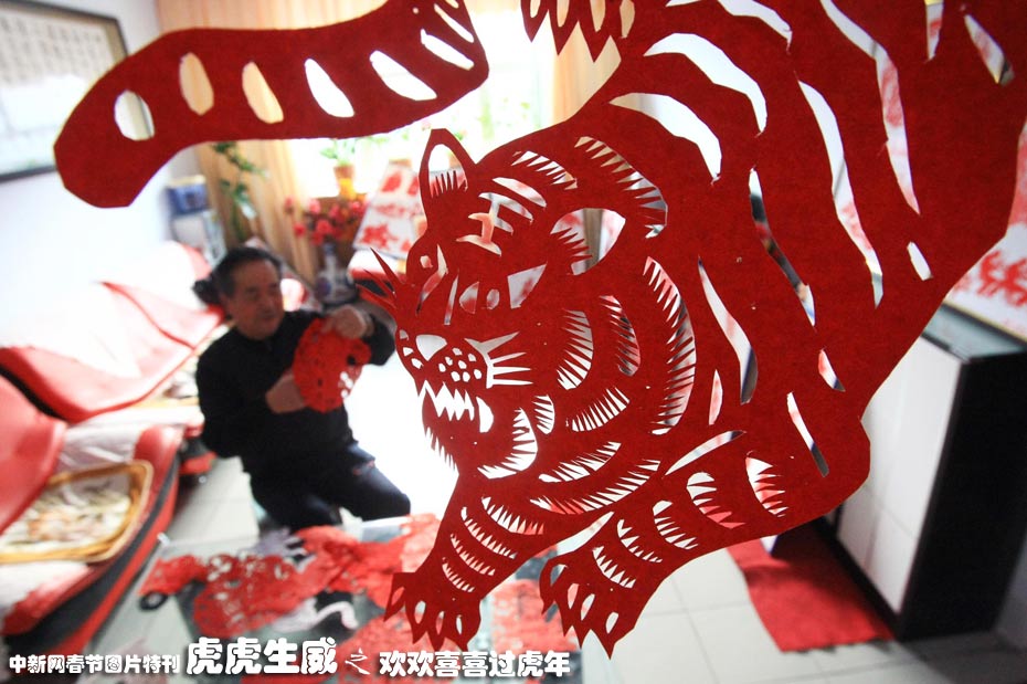 2月1日,已有56年剪纸经验的新疆奇台县71岁民间剪纸艺人李万发正在家中精心剪裁各类虎图案,准备赠与亲朋好友。中国农历新年即将到来,新疆各地以各种方式迎接农历虎年的到来。中新社发 刘新 摄