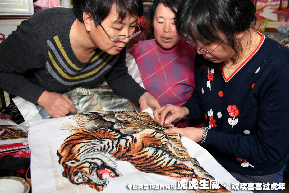 12月21日,市民们展示绣好的“虎年生肖”苏绣作品。虎年临近,北京市怀柔区泉河街道社区居民苏绣“虎生肖”图画,抒发对新年的美好祝福和期盼,歌颂美好生活迎接虎年的到来。中新社发 卜向东 摄