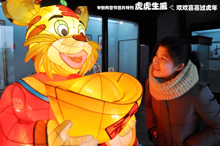 2月3日,一名游客在南京民俗博物馆举办的“虎年民间艺术大展”上观赏“虎灯”。此次大展展示了云锦、剪纸、金箔、灯彩等20个门类50多名艺术家和传承人的近百件民间虎文化作品。据了解,虎年民间艺术大展4月5日结束。 中新社发 谷昌旺 摄