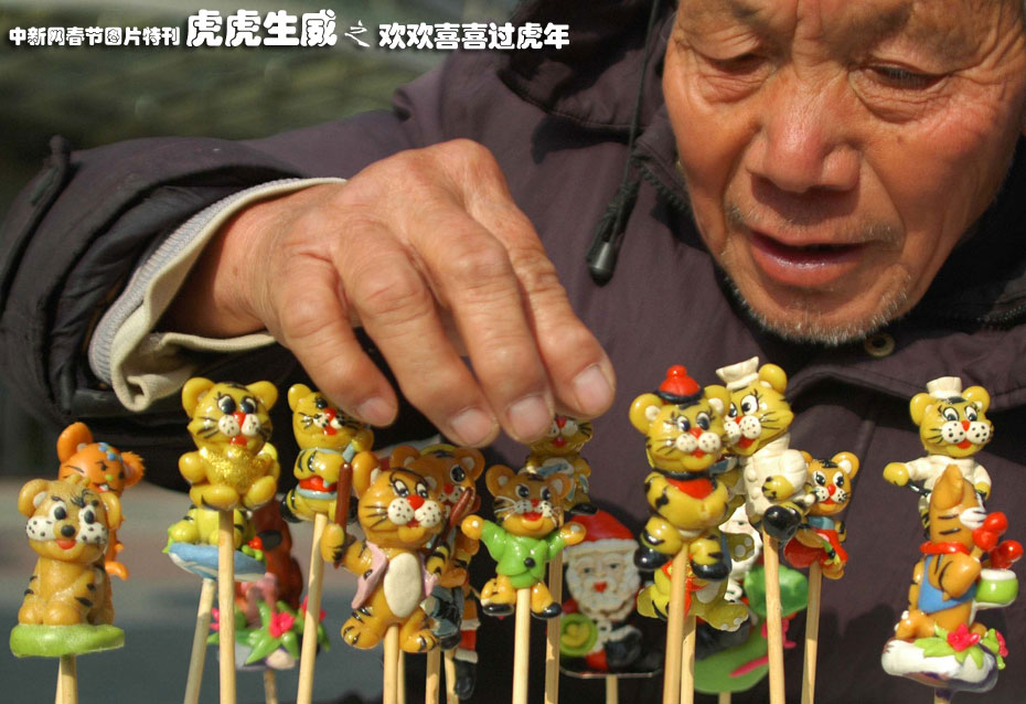 2009年12月5日,民间艺人孟尔珍在整理捏制的面“虎”。虎年即将来临,74岁的江苏扬州民间面塑艺人孟尔珍捏制出许多神态各异的面“虎”临街售卖。这种由面粉、香油、蜂蜜、甘油等近十种配料做成的面“虎”,深受孩子和年轻人的喜爱。 中新社发 张丙涛 摄