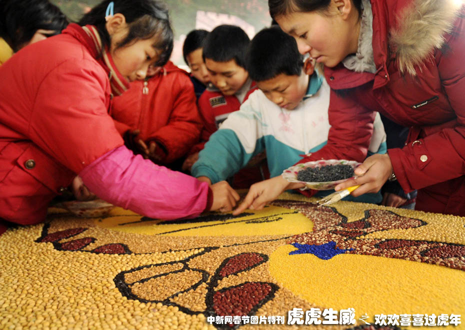 2009年12月中旬,山东省枣庄市山亭区建银希望小学手工制作兴趣小组的学生在老师的指导下,用黄豆、黑豆、小麦、豌豆、小米等粮食粘贴成活泼可爱的“五谷虎”,喜迎即将到来的农历虎年。图为枣庄市山亭区建银希望小学手工制作兴趣小组的学生和老师一起制作“五谷虎”。中新社发 李宗宪 摄
