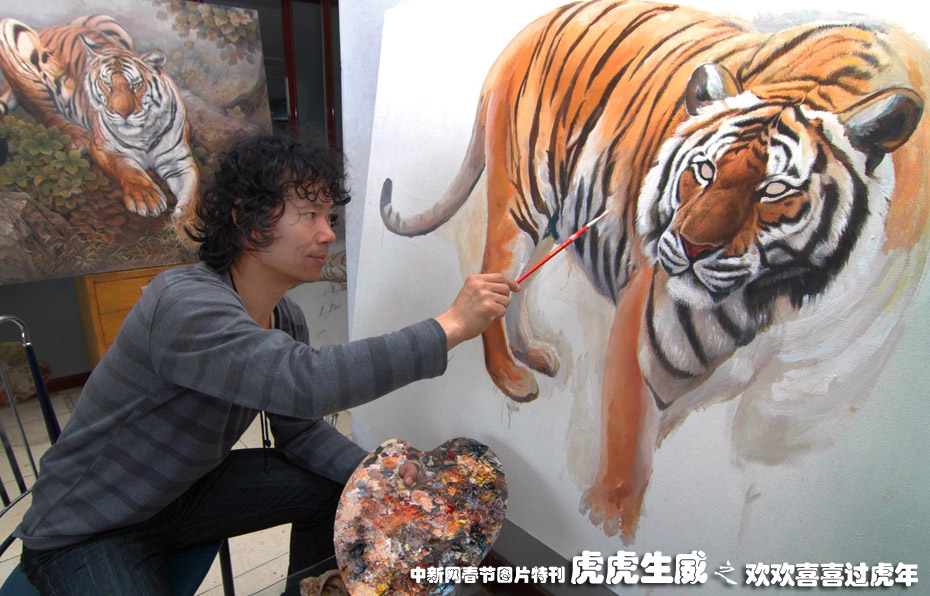 12月15日,辽宁省凌海市新庄子乡礼中村的返乡农民工刘玉红利用打工时学到的画画技艺,回乡自主创业。他把中国画传统技法与油画结合,创作一系列以“虎”为主题的作品,被不少国内外美术爱好者收藏,成功实现再就业。中新社发 李铁成jz 摄