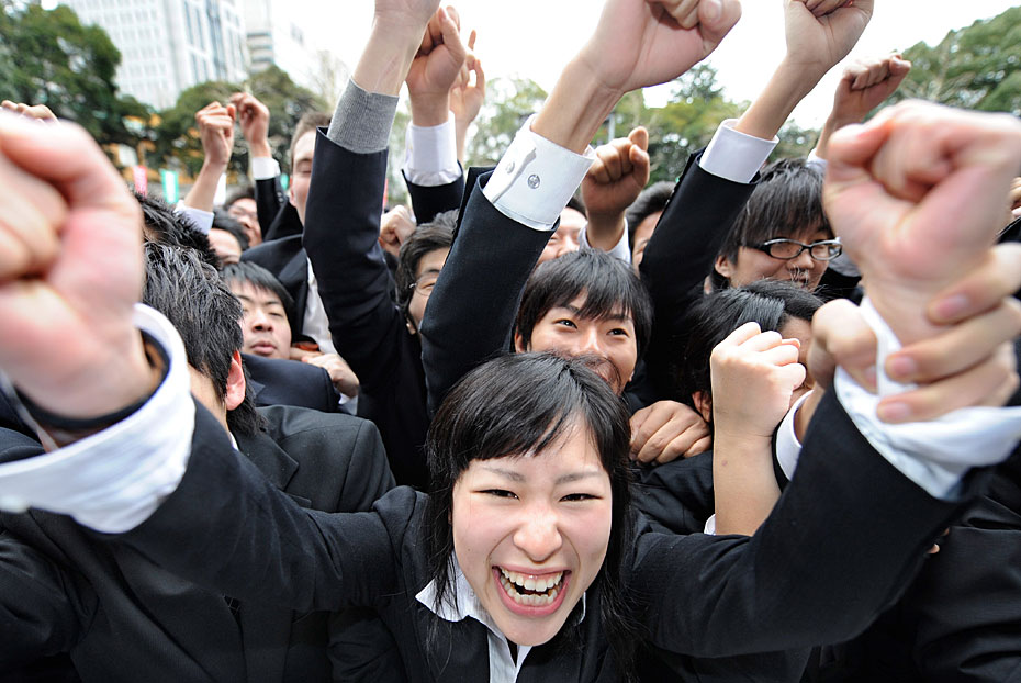2月10日,日本东京职业学校的学生在求职动员会上伸出拳头展现信心。日本的失业率达5%,2011届毕业生将面临严峻就业形式。图片来源:中国新闻网