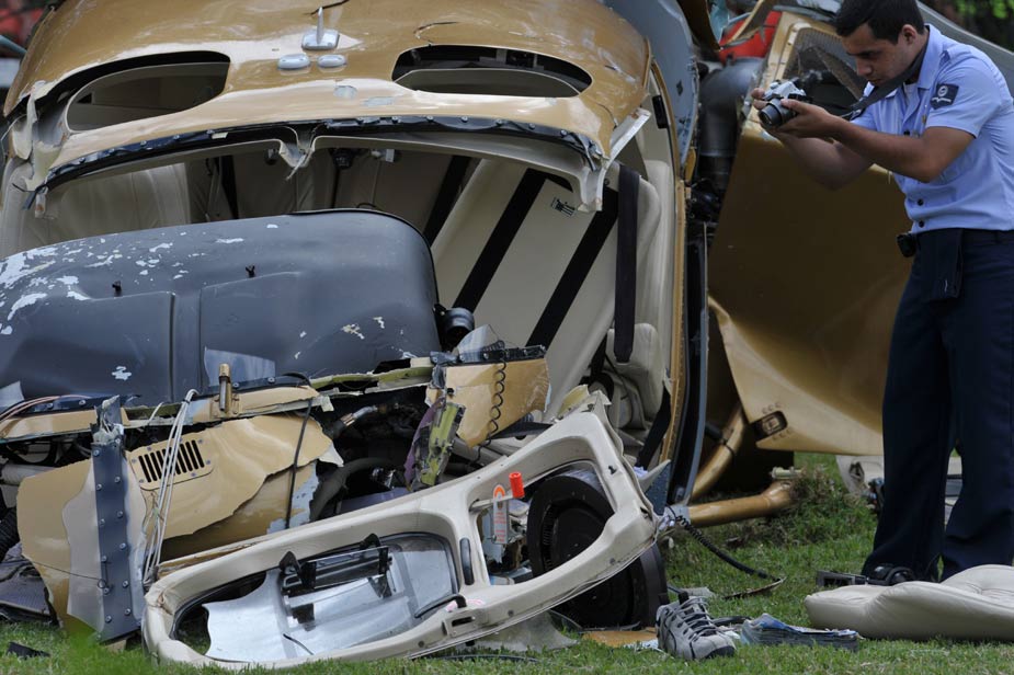 当地时间2月10日上午,巴西记录电视台的一架直升机在巴西圣保罗南部一赛马俱乐部的草坪上坠落,一名飞行员当场身亡。图片来源:中国新闻网