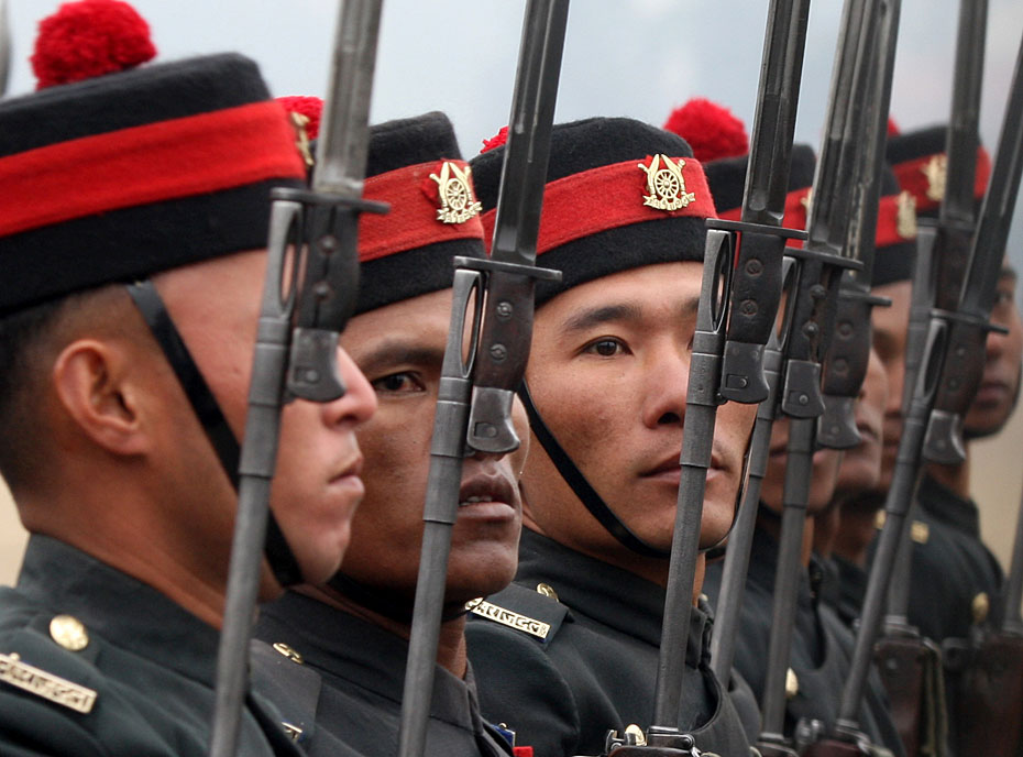 当地时间2月12日,尼泊尔士兵在首都加德满都举行了建军节阅兵式。尼泊尔总统和总参谋长检阅了受阅部队。图片来源:中国新闻网