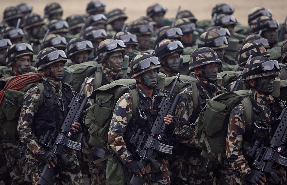 当地时间2月12日,尼泊尔士兵在首都加德满都举行了建军节阅兵式。尼泊尔总统和总参谋长检阅了受阅部队。图片来源:中国新闻网