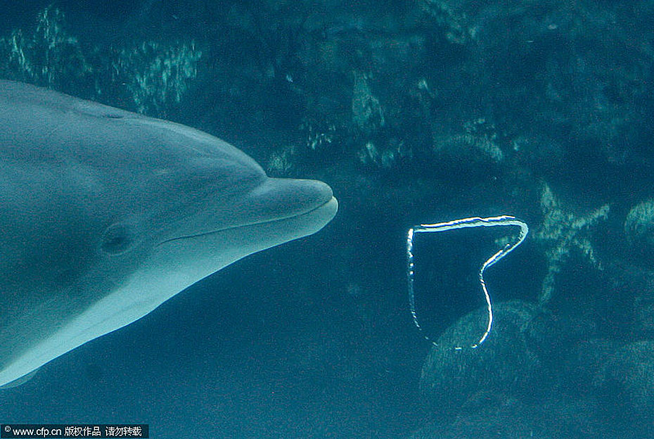 近日,美国奥兰多海洋世界的一只宽吻海豚吹出“心形”气泡,似乎要在情人节来临前夕传达浓浓爱意。图片来源:CFP