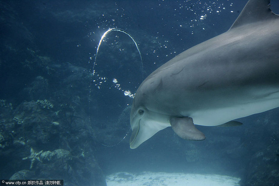 近日,美国奥兰多海洋世界的一只宽吻海豚吹出“心形”气泡,似乎要在情人节来临前夕传达浓浓爱意。图片来源:CFP