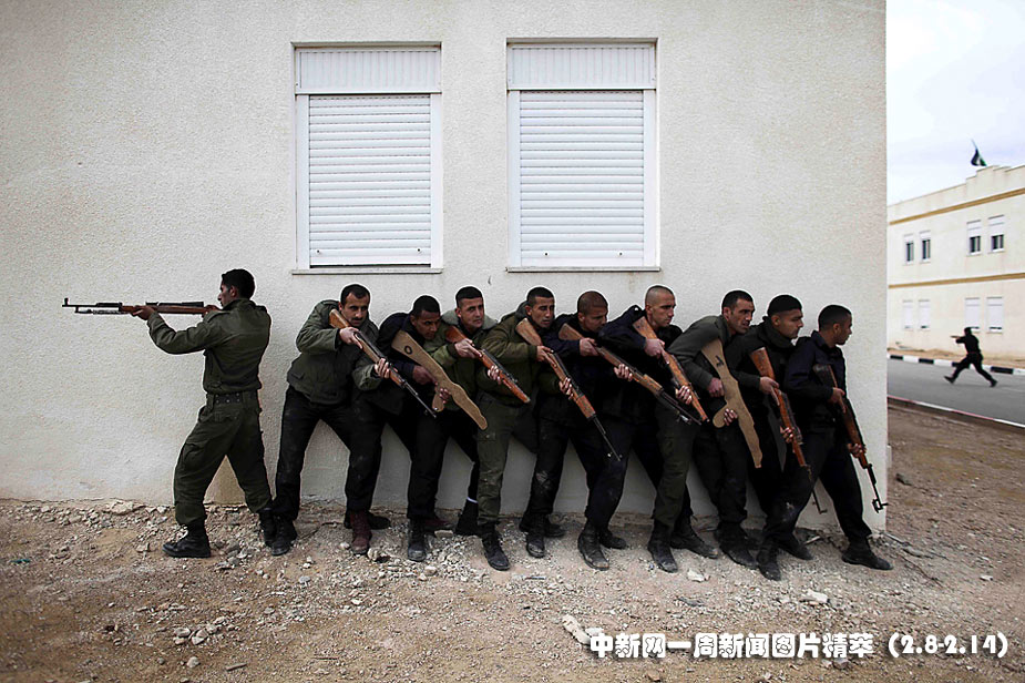 周一(8日)在约旦河西岸Jericho的一处基地,巴勒斯坦安全人员手持模型枪参加训练。