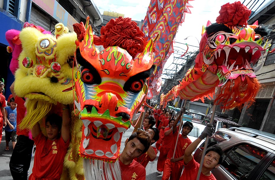 图为菲律宾马尼拉中国城的居民在舞龙庆祝新年。