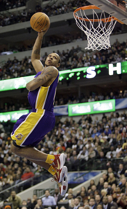 图为洛杉矶湖人队的香农布朗进行扣篮表演。