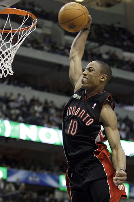 图为多伦多猛龙队的德罗赞进行扣篮表演。