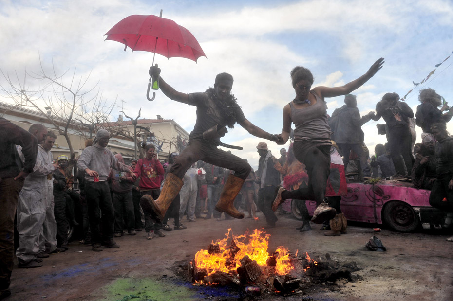 2月15日,希腊港口加拉西迪,狂欢者在街头参加“面粉大战”。“面粉大战”是当地庆祝狂欢季结束的一项传统活动,随后将是为期40天的斋戒月直至复活节。图片来源:中国新闻网