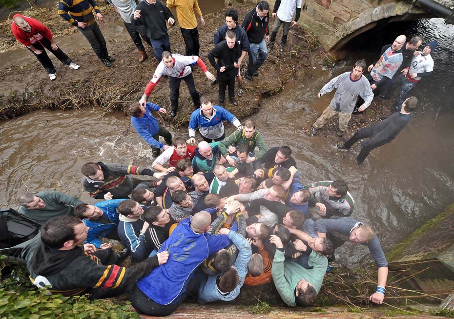 2月16日,英国阿什本的小镇举办忏悔节,每年举办忏悔节足球赛是一项古老的传统,有数百年的历史,最早的文字记录是1683年。图片来源:中国新闻网