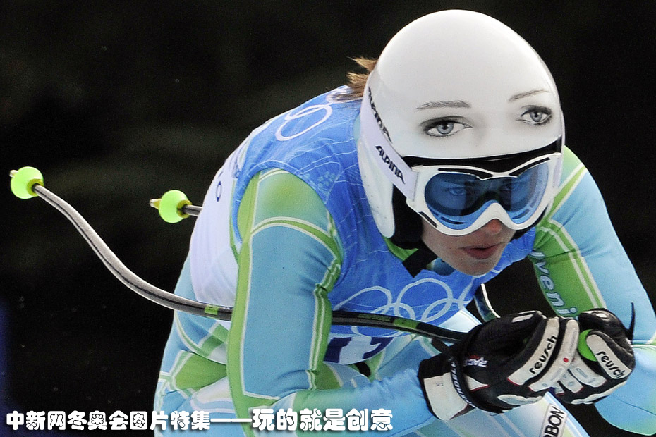速降滑雪赛场上,斯洛文尼亚美女选手头戴“美女”头盔。图片来源:中国新闻网