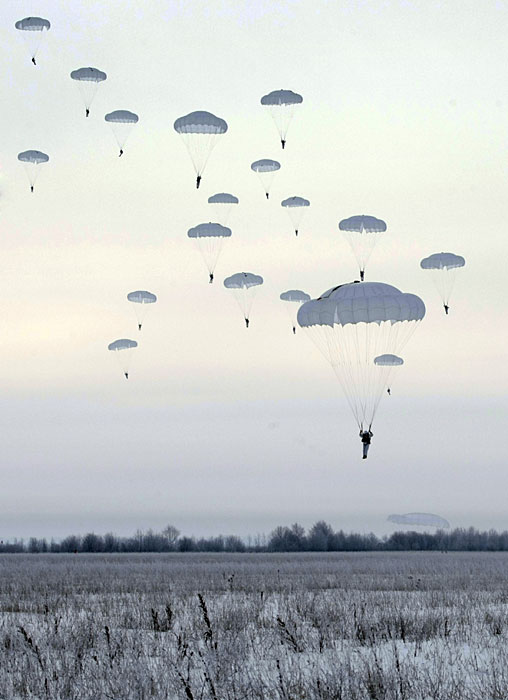 2月18日,俄罗斯第98空降师在莫斯科以东320公里的伊万诺沃市附近举行雪地空降演习。图片来源:中国新闻网