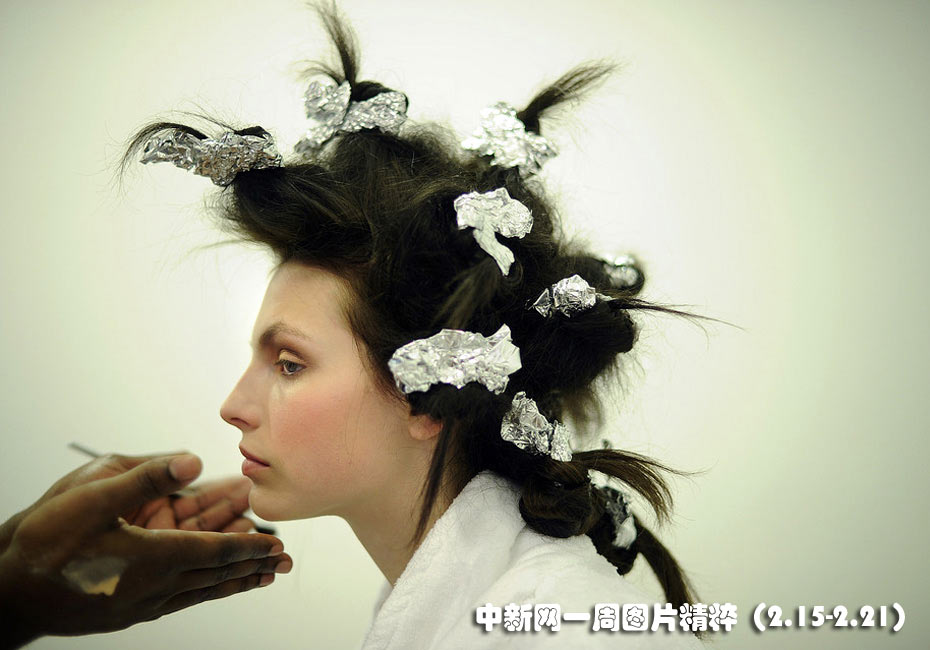 2月17日(周三),一个模特在2010年纽约秋季时装周后台化妆。