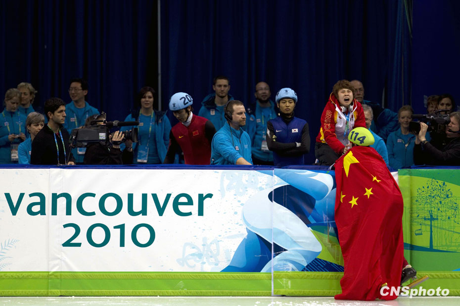 2月21日中午,刚刚结束的冬奥会短道速滑女子1500米决赛中,中国选手周洋力压各路名将,以破奥运会纪录的2分16秒993的成绩夺冠,为中国代表团添得第三金。中新社发 盛佳鹏 摄