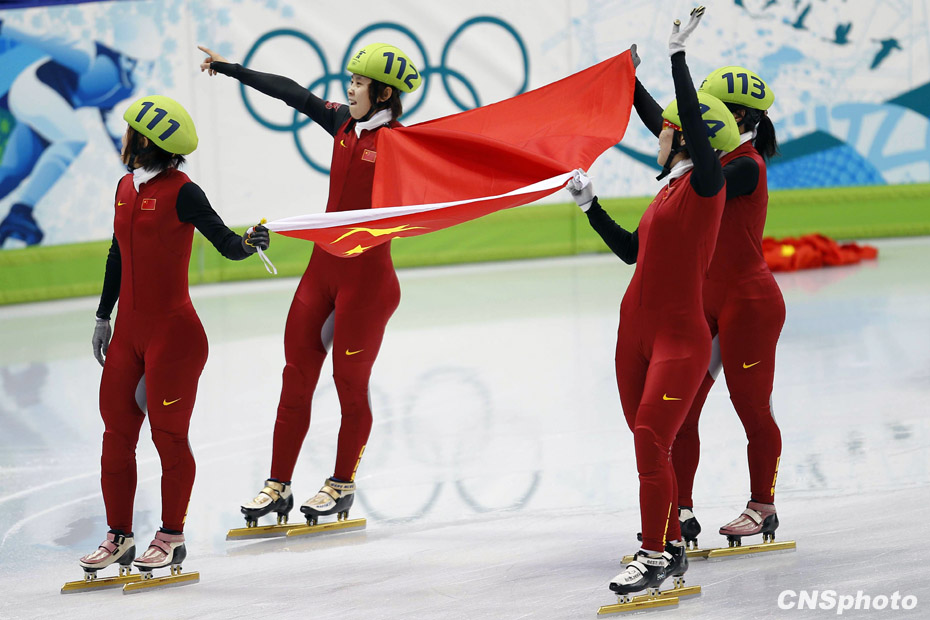 当地时间2月24日,温哥华冬奥会女子短道速滑3000米接力A组决赛中,中国队王濛、周洋、孙琳琳、张会四朵金花联袂出击,最终将金牌归入中国队囊中。图片来源:中国新闻网