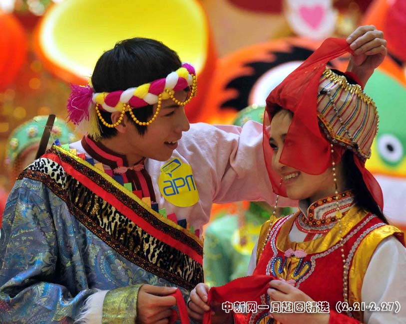 为迎接元宵节,香港创纪之城将举行三大特色少数民族婚礼,包括最多人口的壮族、好客的苗族和能歌善舞的蒙古族。25日,商场预演蒙古族新郎迎接新娘片段。图片来源:中国新闻网>>点击观看详细内容