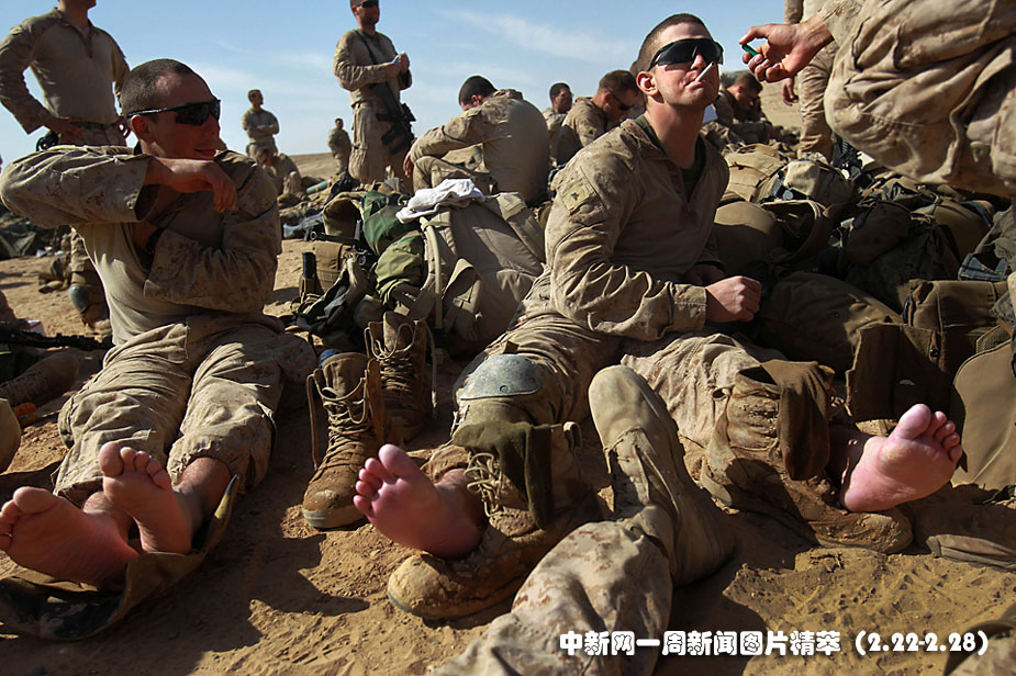 23日(周二),在阿富汗马尔贾城,美军陆战队士兵们在行动结束后坐下来休息。