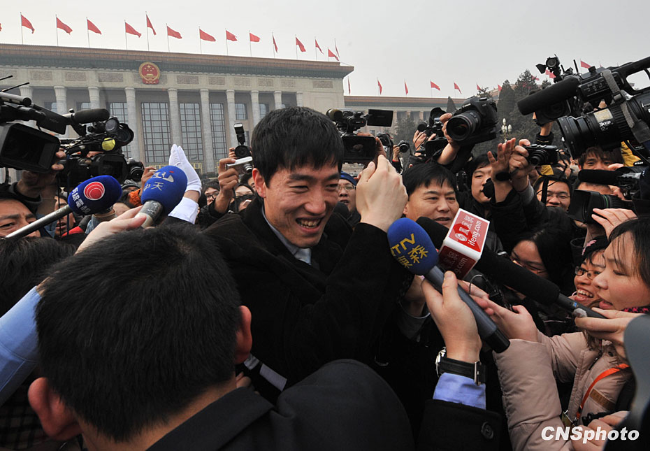 3月3日下午,政协委员刘翔出席全国政协十一届三次会议开幕式,在北京人民大会堂外被媒体重重包围,艰难脱身。中新社发 贾国荣 摄