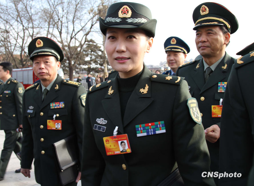 3月5日上午9时,十一届全国人大三次会议在北京隆重开幕。国务院总理温家宝作政府工作报告。图为来自解放军代表团的青年歌唱家谭晶步入会场。中新社发 韩苏原 摄